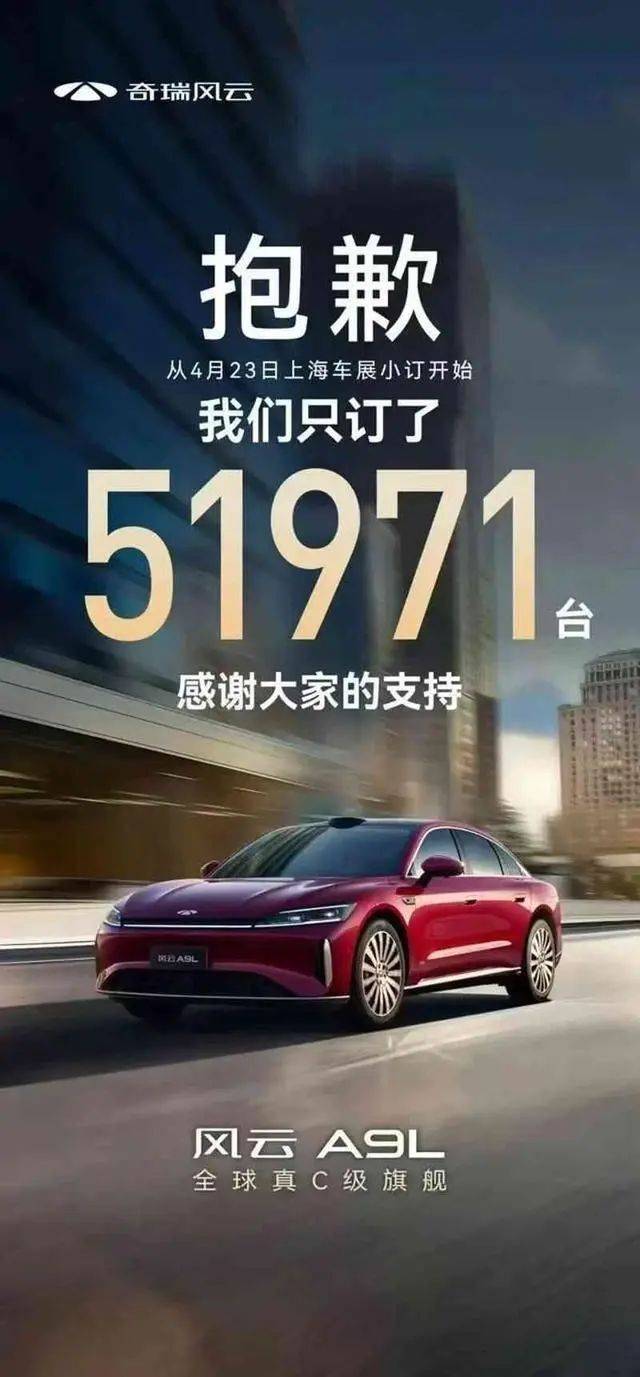 同一天发布会的奇瑞风云A9L,只有5.1万订单,在朋友圈跟大家说抱歉,就像老黄牛跟大家说:抱歉,我已经累得站不起来了,也只犁了三亩地,人家是拖拉机,划时代的机器,我抱歉我生而为牛,我们要说,我们抱歉,我们生而为人不是人家那样的神!